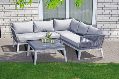 Lounge-Set bestehend aus einem Ecksofa und einem Tisch - Gestell aus Akazienholz und Aluminium, bespannt mit Polyrope in grau - inklusive Sitz- und Rückenkissen - wetterbeständig und langlebig